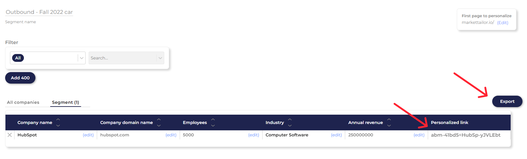 6. You can export the segment as a CSV if you're using an emailing tool we don't support yet. The export includes the shortform URL but also all the personalized pages in the segment with the unique URLs for each contact.